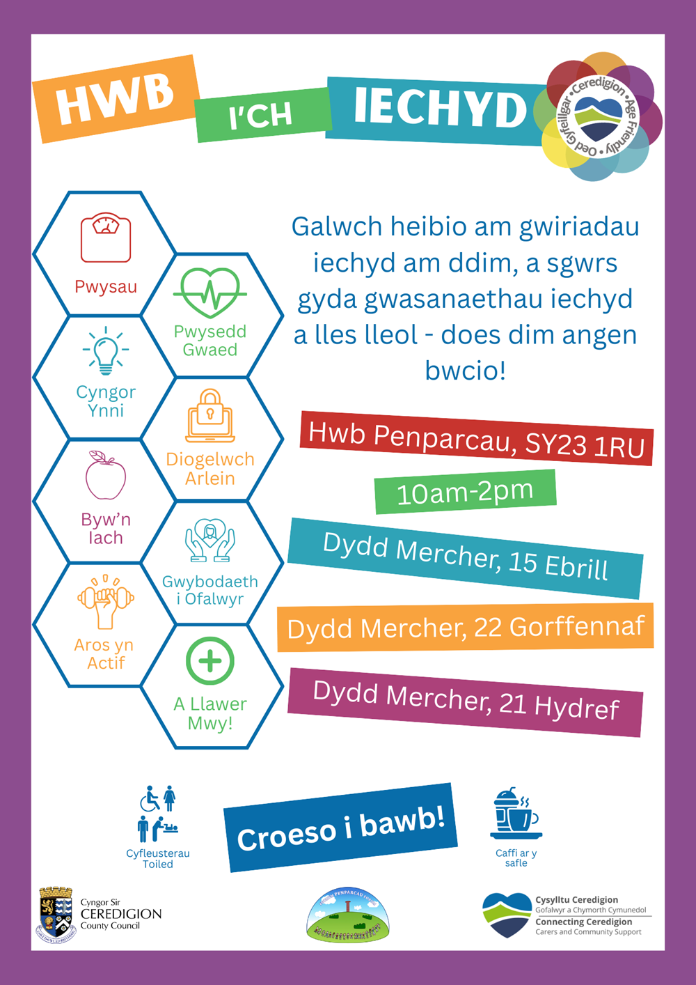 Cyfle i gwrdd â’r Cysylltwyr Cymunedol, Swyddog Ceredigion Oed Gyfeillgar, Severn Wye, a’r Gwasanaeth Gwybodaeth i Ofalwyr.