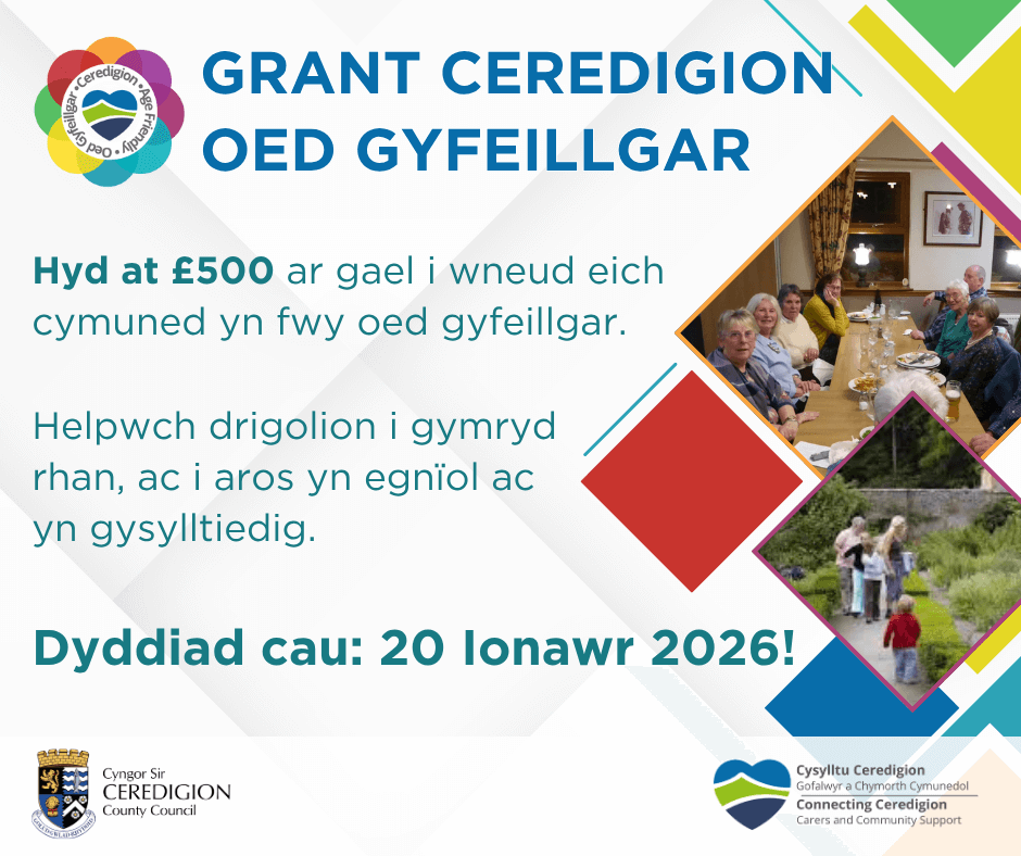 Darganfod mwy a gwneud cais ar wefan Cysylltu Ceredigion - Cronfa Ceredigion Oed Gyfeillgar 2026.
