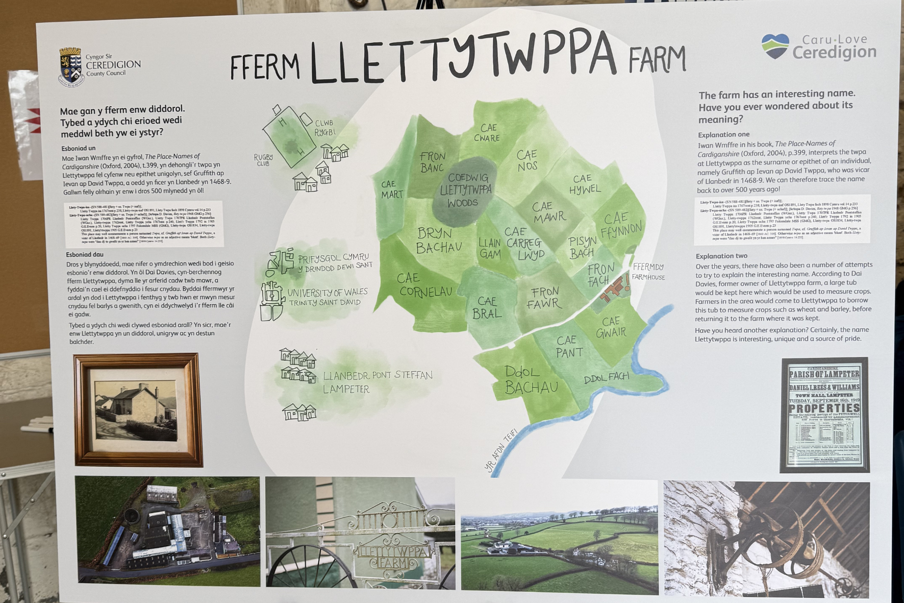 Cafwyd hefyd gyfle i ddysgu mwy am ystyr a tharddiad enw’r fferm. Yn ôl cyfrol Iwan Wmffre, The Place-Names of Cardiganshire (Oxford, 2004), mae’r ‘twppa’ yn cyfeirio at gyfenw neu epithet unigolyn, sef Gruffith ap Ievan ap David Twppa, a oedd yn ficer yn Llanbedr yn 1468-9. Yn ogystal â hyn, esbonia Dai Davies, cyn-berchennog y fferm, mai yn Lletttytwppa yr arferid cadw twb mawr fyddai’n cael ei ddefnyddio i fesur cnydau. Byddai ffermwyr yr ardal yn dod i Lettytwppa i fenthyg y twb hwn er mwyn mesur cnydau fel barlys a gwenith, cyn ei ddychwelyd i’r fferm lle câi ei gadw. Tybed a ydych chi wedi clywed esboniad arall?